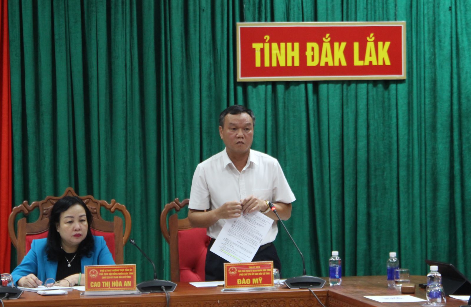 Phó Bí thư Thường trực Tỉnh ủy, Chủ tịch HĐND tỉnh, Chủ tịch Ủy ban bầu cử tỉnh Cao Thị Hòa An và Phó Chủ tịch UBND tỉnh, Phó Chủ tịch Ủy ban bầu cử tỉnh Đào Mỹ đồng chủ trì phiên họp.