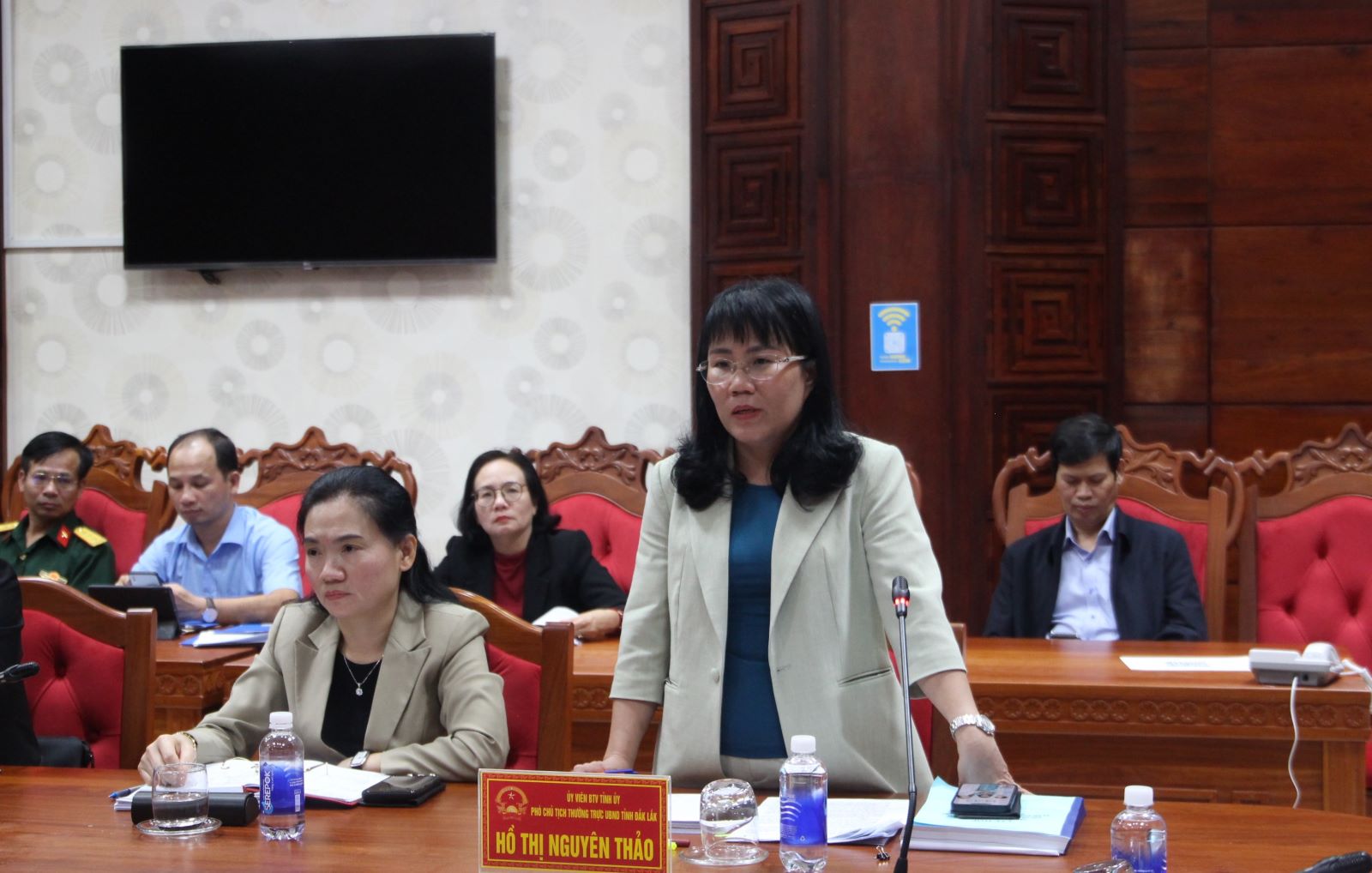 Ủy viên Ban Thường vụ Tỉnh ủy, Phó Chủ tịch Thường trực UBND tỉnh Hồ Thị Nguyên Thảo phát biểu thảo luận tại phiên họp.