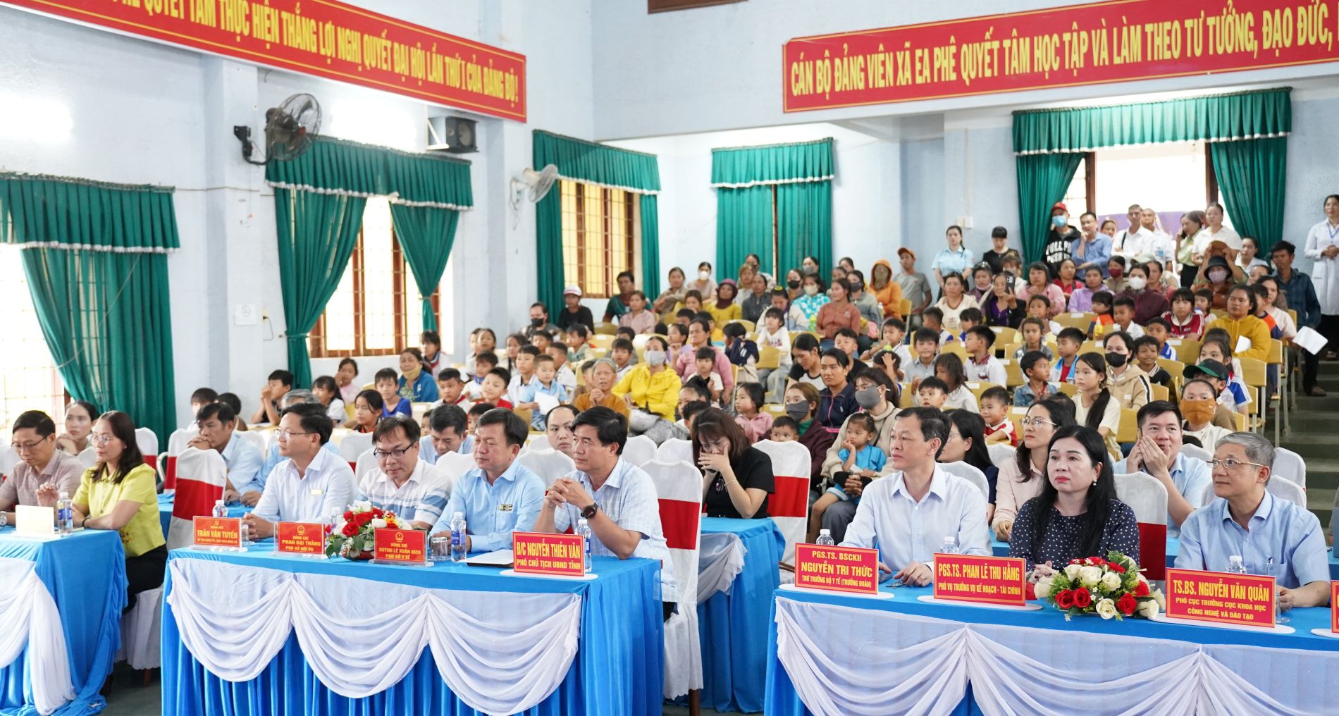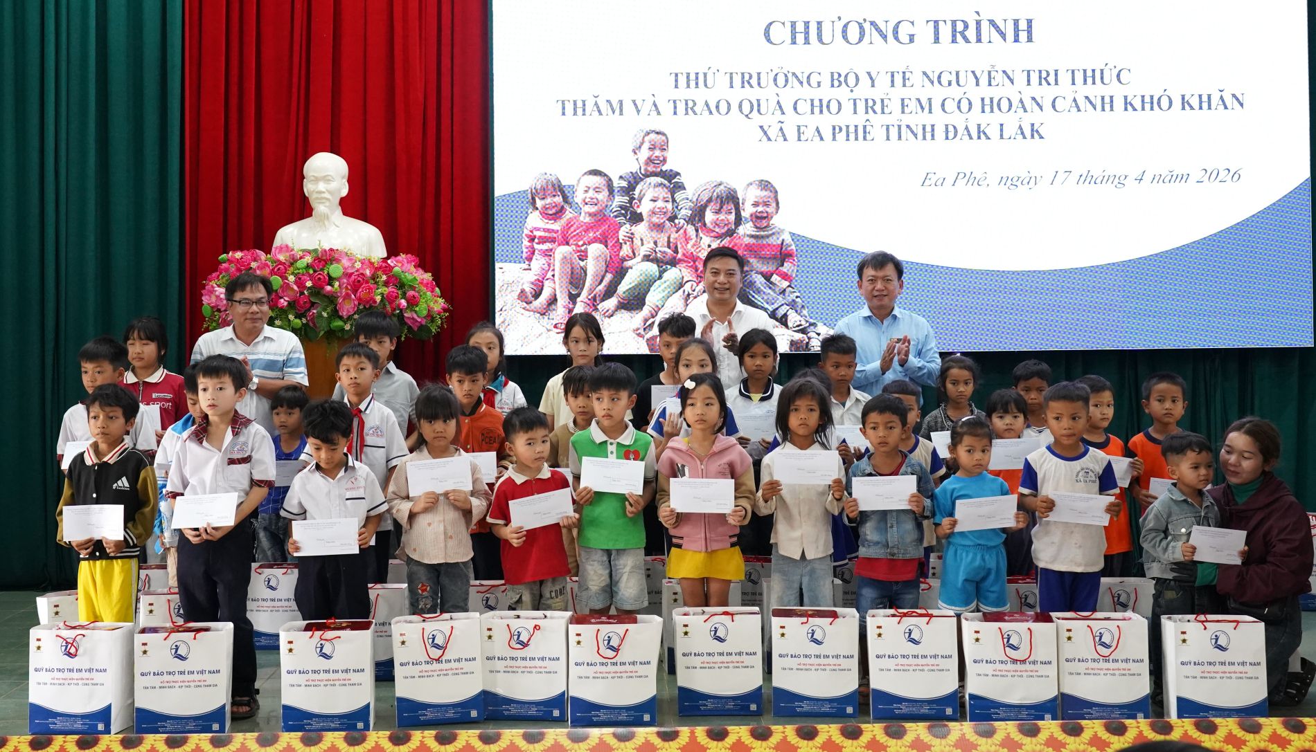 Tại chương trình, Thứ trưởng Bộ Y tế Nguyễn Tri Thức cùng đoàn công tác và lãnh đạo địa phương đã trực tiếp thăm hỏi tình hình sức khỏe, điều kiện sinh hoạt, học tập của các em, đồng thời trao tặng 100 suất quà cho 100 em có hoàn cảnh khó khăn trên địa bàn xã Ea Phê, mỗi suất quà trị giá 01 triệu đồng.