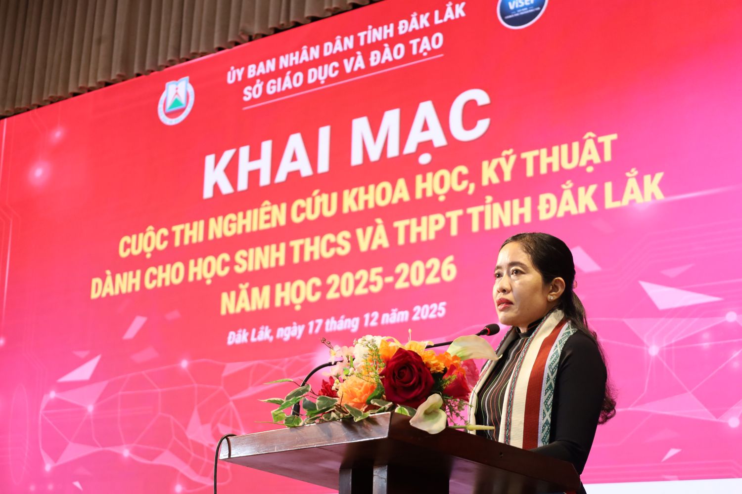 Phát biểu khai mạc, TS Lê Thị Thanh Xuân - Giám đốc Sở GD&ĐT nhấn mạnh, Cuộc thi NCKHKT năm nay mang ý nghĩa đặc biệt khi được tổ chức sau hợp nhất hai tỉnh Phú Yên – Đắk Lắk và triển khai mô hình chính quyền địa phương hai cấp. Đây không chỉ là sự thay đổi về địa giới hành chính, mà còn là sự hợp nhất về nguồn lực, trí tuệ và khát vọng phát triển, tạo thêm cơ hội để học sinh Đắk Lắk tham gia, cạnh tranh ở các sân chơi khoa học cấp quốc gia.