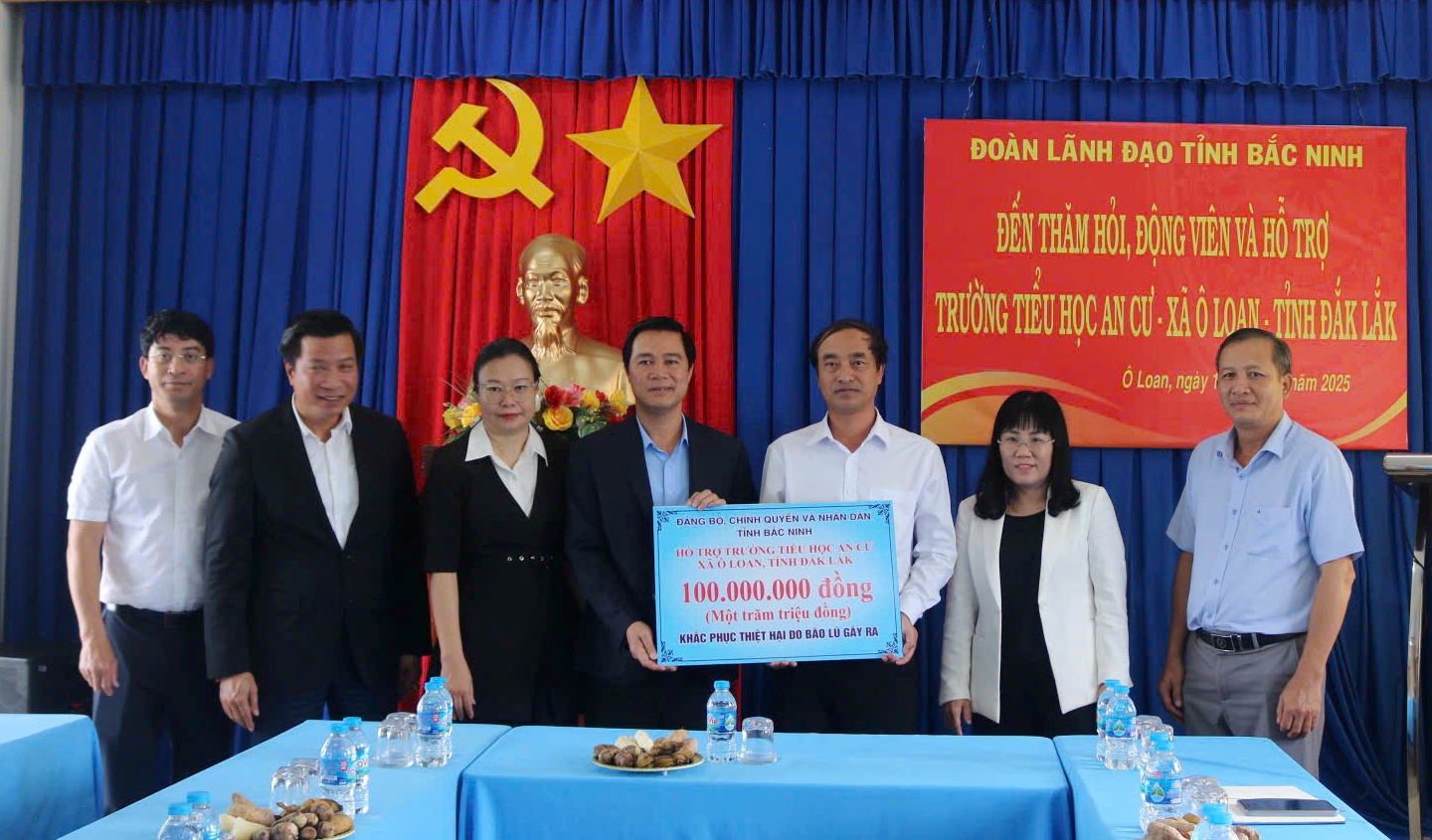 Đoàn công tác của tỉnh Bắc Ninh đến thăm, trao tặng 100 triệu đồng cho Trường Tiểu học An Cư, xã Ô Loan.