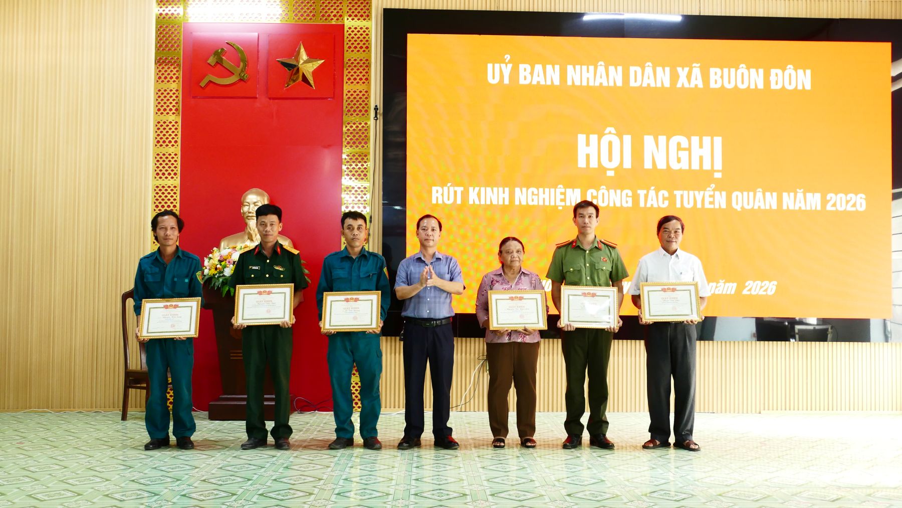 Dịp này, UBND xã Buôn Đôn tặng giấy khen cho 2 tập thể và 6 cá nhân có thành tích xuất sắc trong công tác tuyển chọn, gọi công dân nhập ngũ và thực hiện nghĩa vụ Công an nhân dân năm 2026.