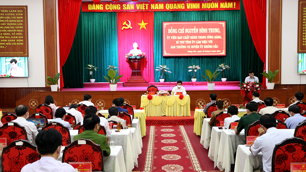 Phát biểu kết luận buổi làm việc, đồng chí Nguyễn Đình Trung - Ủy viên Trung ương Đảng, Bí thư Tỉnh ủy ghi nhận, biểu dương những kết quả đạt được của huyện Krông Pắc trong thực hiện các nhiệm vụ 09 tháng đầu năm 2021. Tiêu biểu như tổng giá trị sản xuất trên các lĩnh vực đều tăng so với cùng kỳ năm 2020, kết quả thu ngân sách nhà nước hoàn thành đạt kết quả tốt; các giải pháp phòng, chống dịch bệnh Covid-19 trên địa bàn huyện được triển khai đồng bộ. Bên cạnh đó, Ban Thường vụ Huyện ủy Krông Pắc, cũng đã chủ động đề ra các giải pháp, kế hoạch để tháo gỡ khó khăn cho doanh nghiệp, người dân tiêu thụ nông sản thời điểm dịch bệnh Covid-19 diễn biến phức tạp.