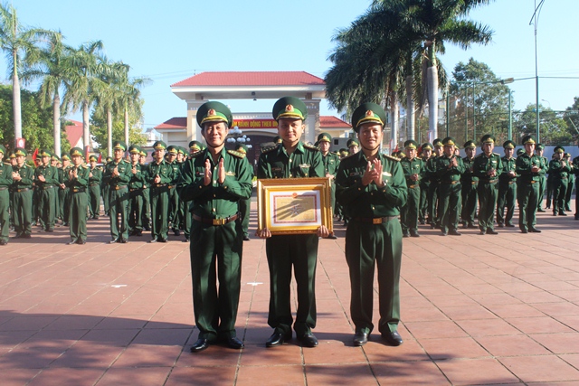 Đại tá Phạm Quang Hùng (trái) chỉ huy trưởng BĐBP tỉnh và đại tá Phạm Hữu Chiến Chính ủy BĐBP tỉnh trao các quyết định khen thưởng cho Đại úy Đậu Phương Hoàng
