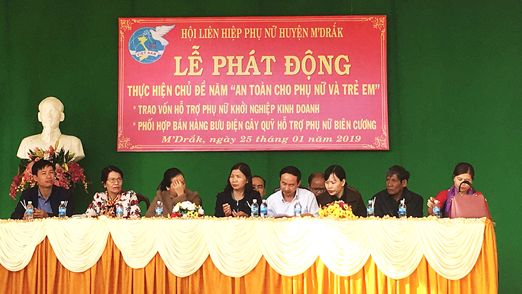 Sáng 25/1/2019, tại Trung tâm văn hóa thể thao huyện M'Đrắk, Hội LHPN huyện đã tổ chức Lễ phát động năm thi đua “An toàn cho phụ nữ và trẻ em” năm 2019 kết hợp trao vốn hỗ trợ phụ nữ khởi nghiệp kinh doanh. Về dự có đồng chí Nguyễn Ngọc Bình, Chủ tịch HĐND huyện; đ/c Chu Thị Thành, Phó Chủ tịch UBND huyện; lãnh đạo đại diện một số phòng ban của huyện và sự có mặt của trên 300 hội viên phụ nữ tiêu biểu đến từ 13 xã, thị trấn.