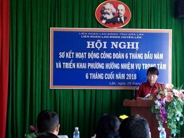 Sáng ngày 29/6, tại Hội trường Liên đoàn Lao động (LĐLĐ) huyện Lắk, Liên đoàn Lao động huyện tổ chức Hội nghị sơ kết hoạt động công đoàn 6 tháng đầu năm và triển khai phương hướng, nhiệm vụ trọng tâm 6 tháng cuối năm 2018.