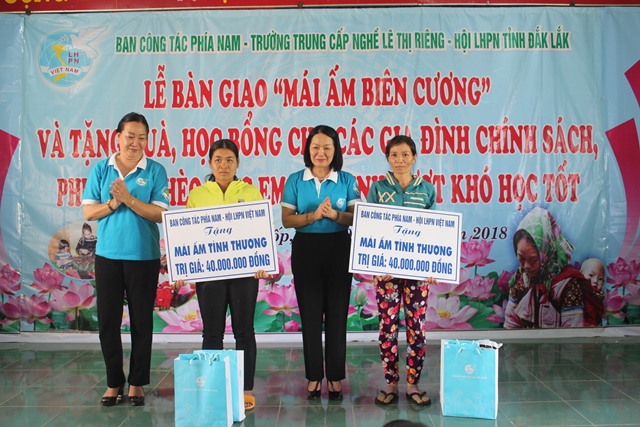 Ngày 8/9/2018 tại UBND xã Ia Lốp huyện Ea Súp tỉnh Đắk Lắk, Trung ương Hội Liên hiệp Phụ nữ, Ban công tác phía nam, trường Trung cấp nghề Lê Thị Riêng, phối hợp với Đồn Biên phòng Ea H’leo - Bộ Chỉ huy Bộ đội Biên phòng tỉnh và Hội phụ nữ khối Lực lượng vũ trang tỉnh trao 352 suất quà, 1.000 cuốn vở, 300 áo sơ mi, 2 tủ đựng tài liệu, 01 dàn máy vi tính tổng trị giá hơn 200 triệu đồng cho những gia đình và học sinh có hoàn cảnh khó khăn trên địa bàn, cùng với đó Ban công tác phía nam đã trao tặng 2 “mái ấm biên cương” trị giá 80 triệu đồng cho 2 gia đình bị ảnh hưởng nặng nề của đợt lốc xoáy vừa qua, cũng trong dịp này Ban công tác phía nam, Trung ương Hội Liên hiệp Phụ nữ đã trao 35 suất học bổng mỗi suất trị giá 1 triệu đồng cho các em học sinh vượt khó học giỏi đồng thời phối hợp với trường Đại học Y dược tp HCM khám chữa bệnh, cấp thuốc cho 500 người, mở lớp may dân dụng cho phụ nữ, tổ chức cắt tóc miễn phí cho học sinh và nhân dân trên địa bàn.
