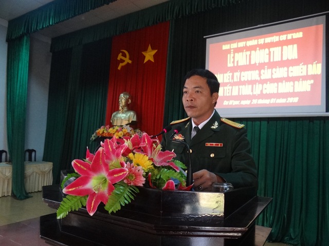 Ngày 24-01-2018 Hội đồng thi đua khen thưởng lực lượng vũ trang huyện Cư M’gar đã tổ chức buổi Lễ phát động thi đua “Đoàn kết, kỷ cương, sẵn sàng chiến đấu, đón tết an toàn, lập công dâng Đảng” chào mừng kỷ niệm 88 năm Ngày thành lập Đảng Cộng sản Việt Nam (03/02/1930-03/02/2018) và mừng xuân Mậu Tuất 2018.