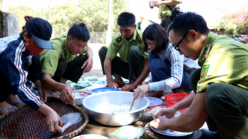Cán bộ công chức, đoàn viên thanh niên của các cơ quan cùng bà con buôn Đrang Phốk chuẩn bị các món ăn cho bữa tiệc tất niên.