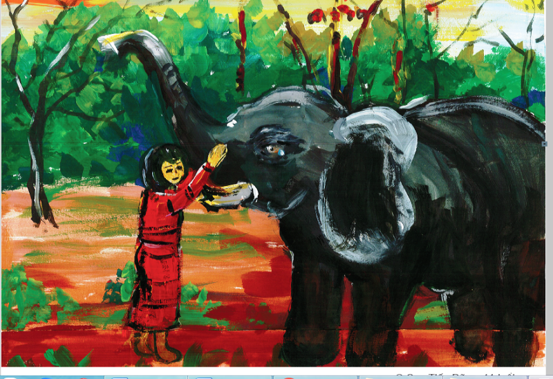Giải Nhất khối THCS Bạn Cao Tiến Dũng (11 tuổi) với tác phẩm “Hạnh phúc của Voi là gì? “mong muốn qua bức tranh của mình gửi đi thông điệp: "Hạnh phúc của voi là gì? Có phải là được con người cưỡi lên chăng?