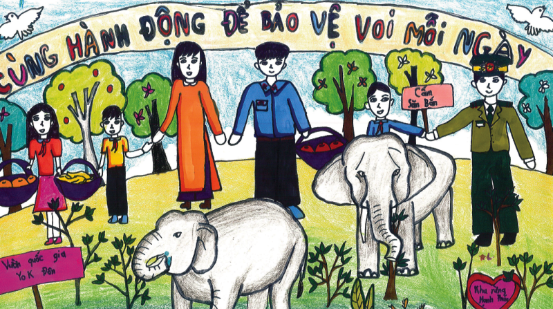 Em H’Phương Linh Êban - học sinh huyện Buôn Đôn chia sẻ: Du khách đến với Buôn Đôn rất hào hứng khi được một lần nhìn thấy, sờ thấy, chậm chí là được cưỡi trên lưng voi. Nhưng rồi, bất giác em chợt nghĩ lại: “Những chú voi thân thiện, đáng yêu này cũng có mong ước được trở về rừng, nơi chúng thỏa sức vùng vẫy trong dòng suối mát và sống cuộc đời thanh bình bên bầy đàn”. Bức tranh dự thi của em mang tên “Tiếng lòng” ra đời mang thông điệp gửi đến mọi người chung tay hành động thân thiện với những chú voi.