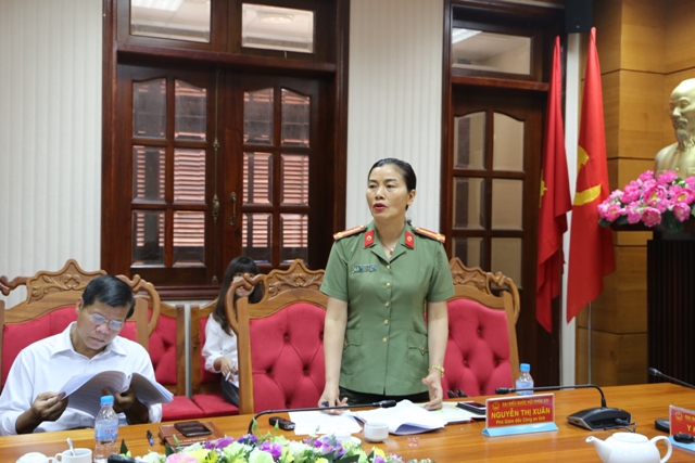 Bà Nguyễn Thị Xuân – Đại biểu Quốc hội, Phó Giám đốc Công an tỉnh phát biểu tại hội nghị