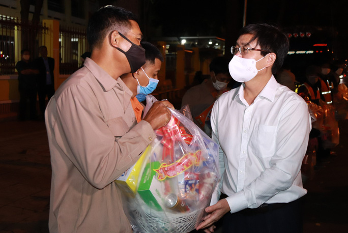 Ông Nguyễn Đình Trung tặng quà công nhân nhân đang làm nhiệm vụ vệ sinh đường phố.