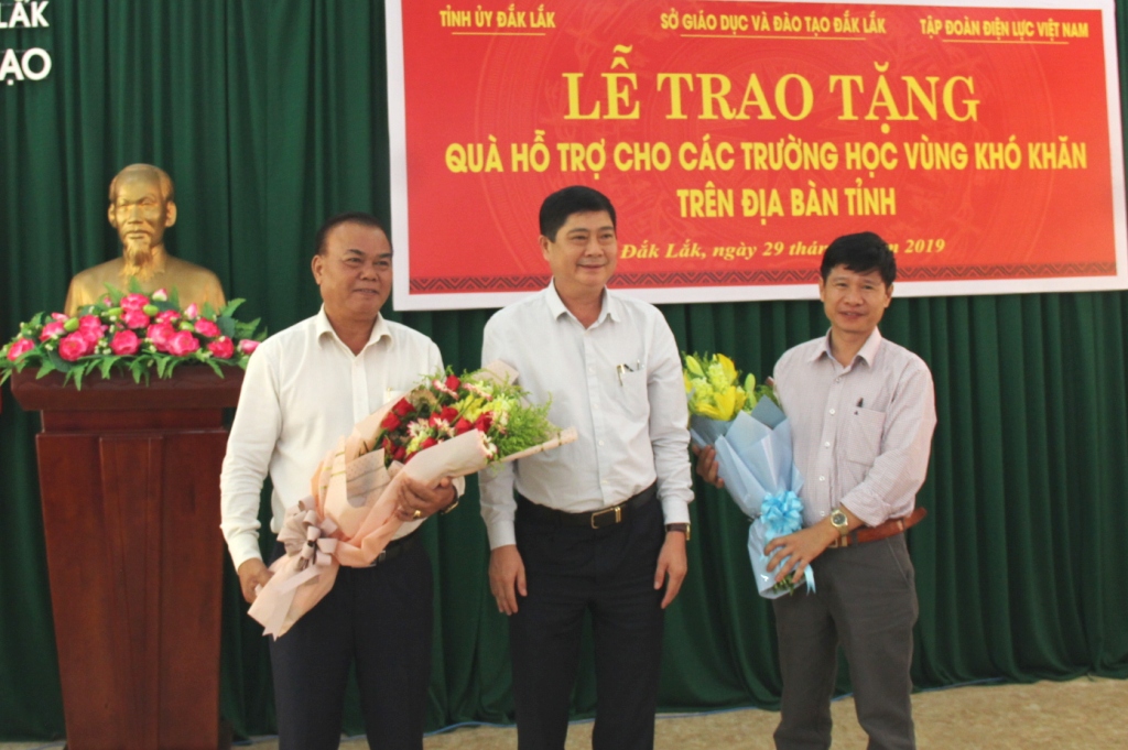 Lãnh đạo ngành Giáo dục và Đào tạo tặng hoa cảm ơn Bí thư Tỉnh ủy Êban Y Phu và nhà tài trợ