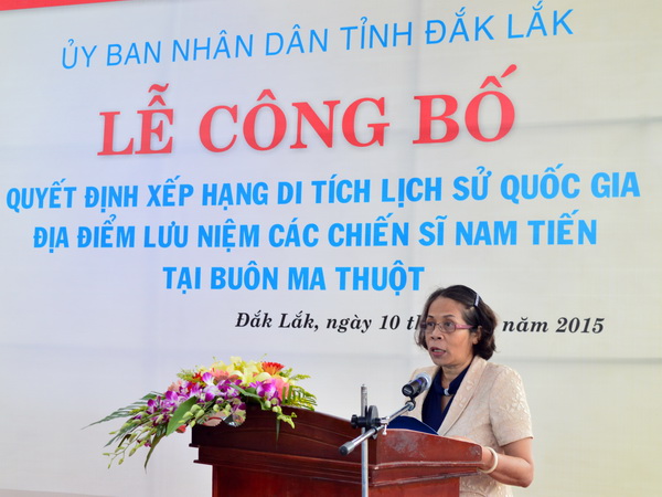 Sáng 10/12, UBND tổ chức Lễ công bố quyết định xếp hạng di tích lịch sử cấp Quốc gia đối với di tích Địa điểm lưu niệm các chiến sỹ Nam tiến tại Buôn Ma Thuột. Đến dự buổi lễ có đồng chí Y Biêr Niê – Phó Bí thư Tỉnh ủy; đồng chí Mai Hoan Niê Kdăm – Phó Chủ tịch UBND tỉnh; các đồng chí lão thành cách mạng, các đồng chí nguyên là lãnh đạo tỉnh qua các thời kỳ cùng đông đảo nhân dân, thanh niên thành phố Buôn Ma Thuột.