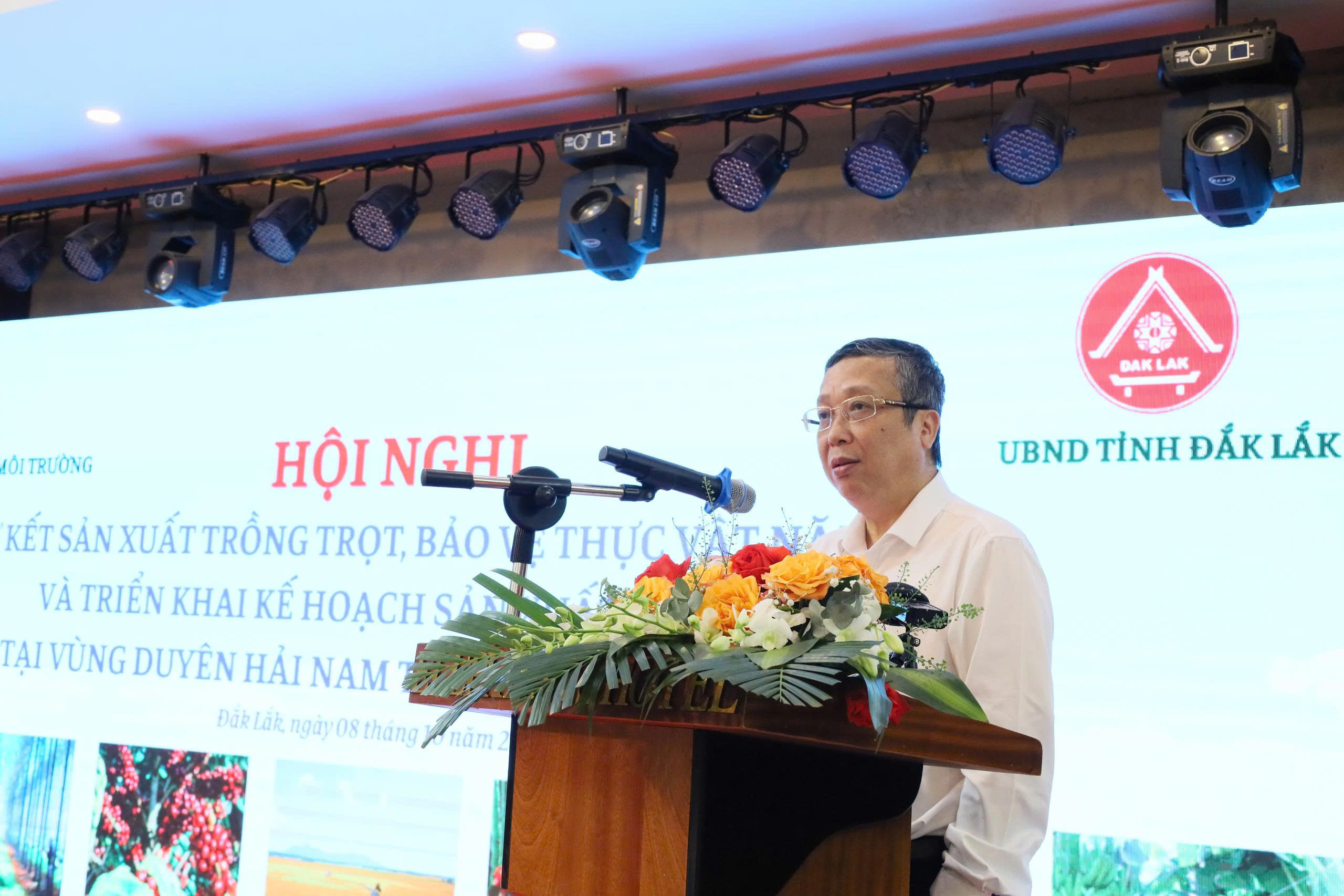 Thứ trưởng Bộ Nông nghiệp và Môi trường Hoàng Trung; Cục Trưởng Cục Trồng trọt và Bảo vệ thực vật Huỳnh Tấn Đạt; Phó Chủ tịch UBND tỉnh Đắk Lắk Nguyễn Thiên Văn đồng chủ trì hội nghị.