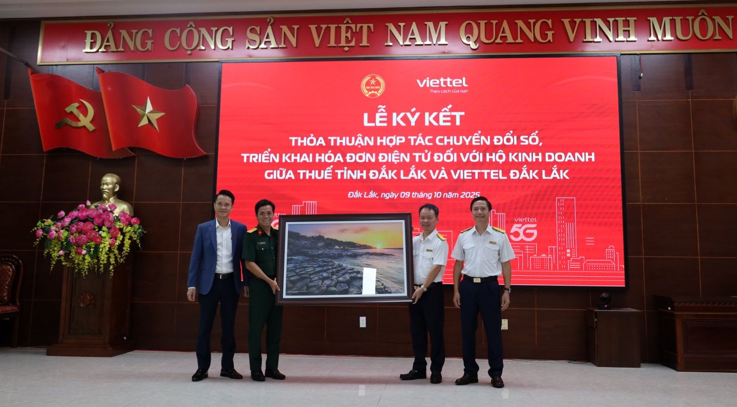 Sáng 9/10, Viettel Đắk Lắk – Chi nhánh Tập đoàn công nghiệp viễn thông quân đội và Thuế tỉnh Đắk Lắk đã ký kết thỏa thuận hợp tác về việc phối hợp hướng dẫn chính sách thuế, hỗ trợ hộ kinh doanh chuyển đổi số, triển khai hóa đơn điện tử (HĐĐT).